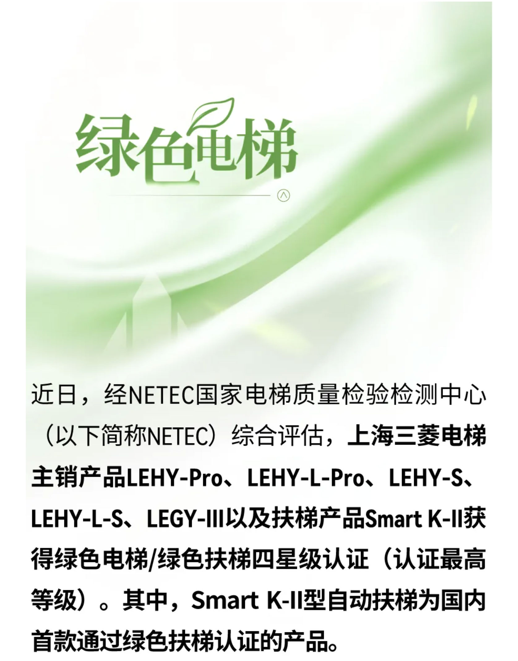 六款主销产品获得NETEC绿色电梯和绿色扶梯最高星级认证