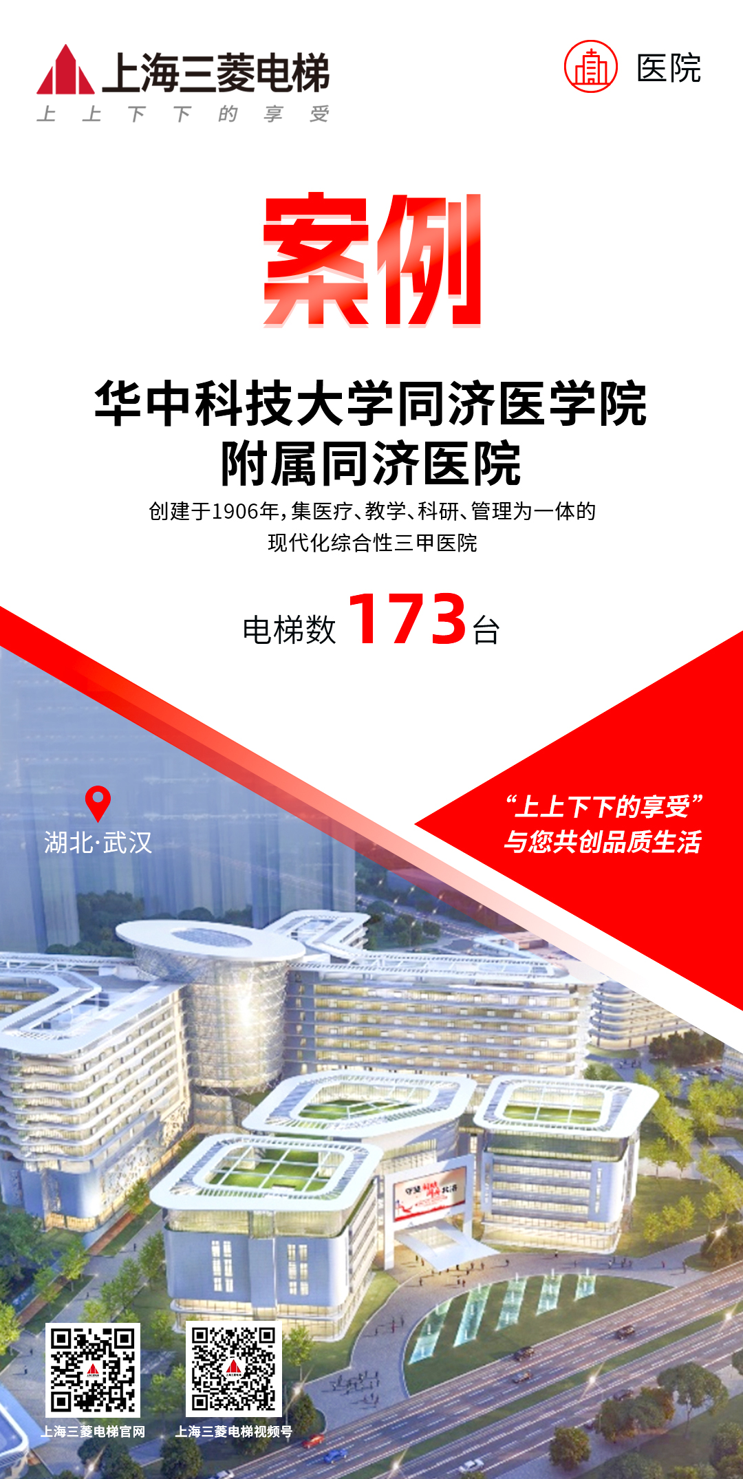 同济主院区院区:1955年建院,共采用三菱电梯10台。同济光谷院区:该项目用地面积为155035.23 平方米由地下2层,地上12层组成,主楼高度为60m。本项目电梯全部采用三菱电梯及自动扶梯72部,最高速度2.5m/s。同济国际康复医学中心:该项目位于武汉市经开区,用地面积9.77万方。总建筑面积约23万方。整个项目将采用46台使用上海三菱电梯,其中38部垂直梯,8部扶梯。同济中法新城院区:位于武汉市蔡甸区,院区规划总面积185亩,总建筑面积15万㎡,本项目电梯全部采用三菱电梯及自动扶梯45部,最高速度2.5m/s。