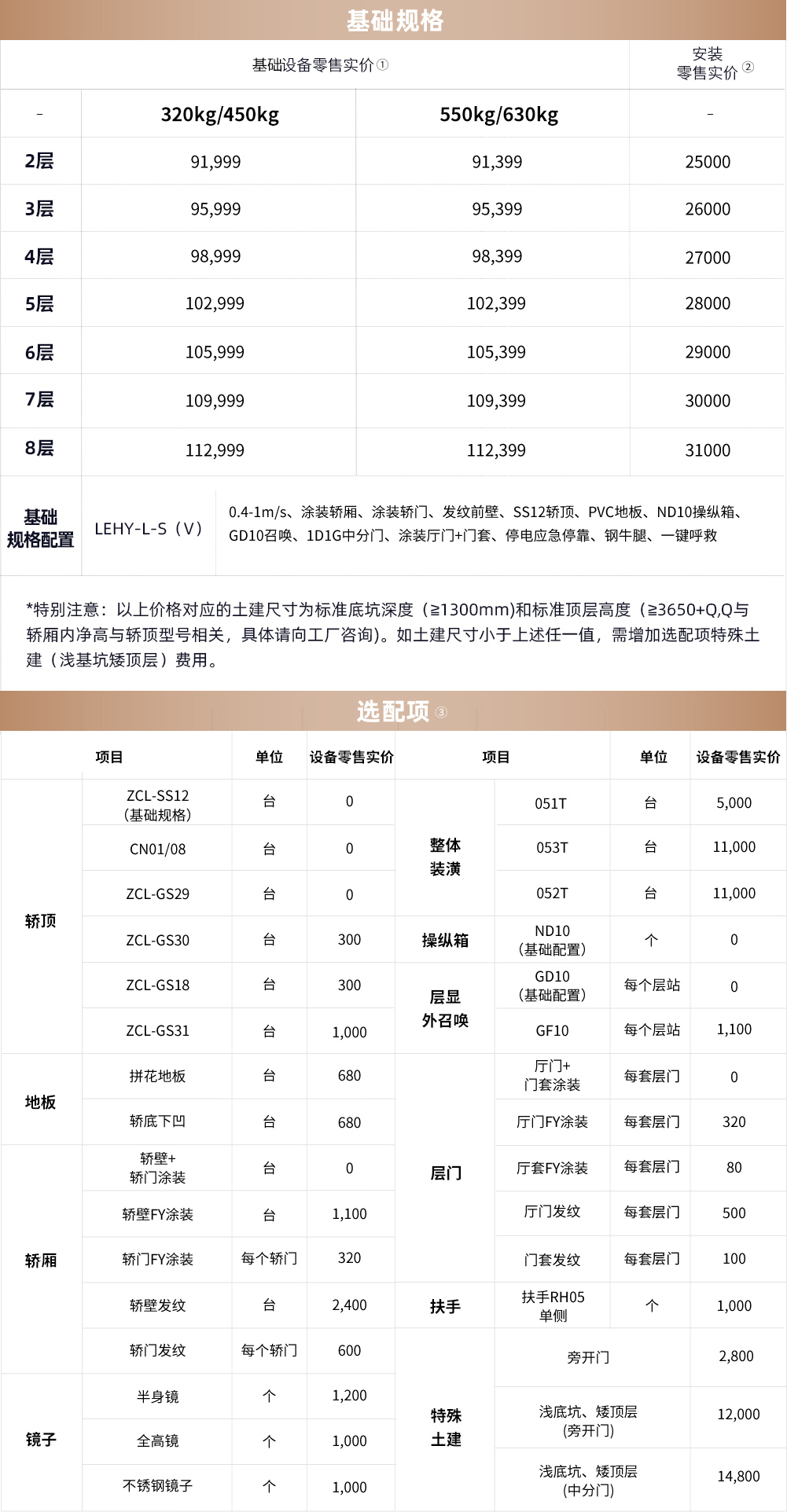 ④有下述任一情况时为浅地坑、矮顶层, 需选特殊土建加价。